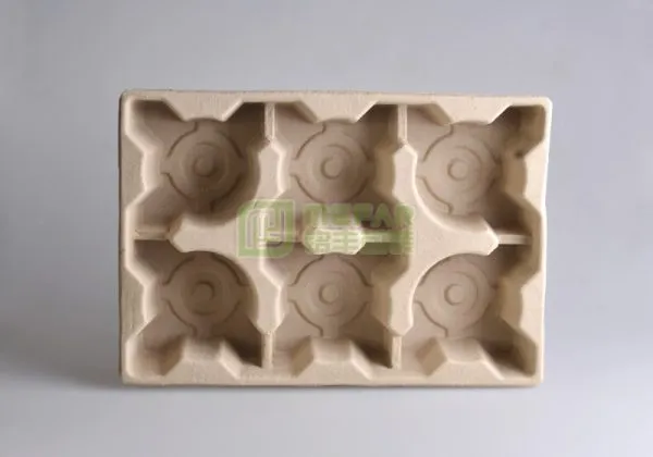 瓶子类黄色干压甘蔗浆纸托(纸塑)由于具有与包装物外型相吻合的几何形状和良好的防震、防冲击、防静电、防腐等理想的保护效果,经各项物理指标测试,其性能和功效足以代替并优于EPS、PS和PVC等包装制品。可按不同被包装产品要求加入施强剂、柔性剂、防水剂、防油剂、防燃剂等多种辅助添加剂实现多种功能,这是发泡胶、EVA、吸塑、卡纸等单一物理性能所做不到的。并且在防震功能、环保、价格及防静电等指标和功能上占据优势。