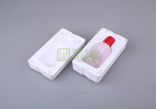 香水瓶白色湿压甘蔗浆纸托(纸塑)由于具有与包装物外型相吻合的几何形状和良好的防震、防冲击、防静电、防腐等理想的保护效果,经各项物理指标测试,其性能和功效足以代替并优于EPS、PS和PVC等包装制品。可按不同被包装产品要求加入施强剂、柔性剂、防水剂、防油剂、防燃剂等多种辅助添加剂实现多种功能,这是发泡胶、EVA、吸塑、卡纸等单一物理性能所做不到的。并且在防震功能、环保、价格及防静电等指标和功能上占据优势。